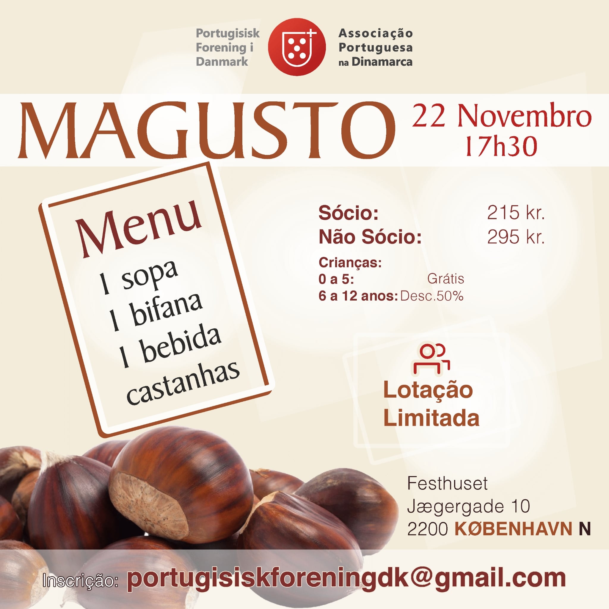 (incluí castanhas, 1 caldo verde, 1 bifana e 1 bebida; teremos opção vegetariana!)- Sócio – 215 kr.